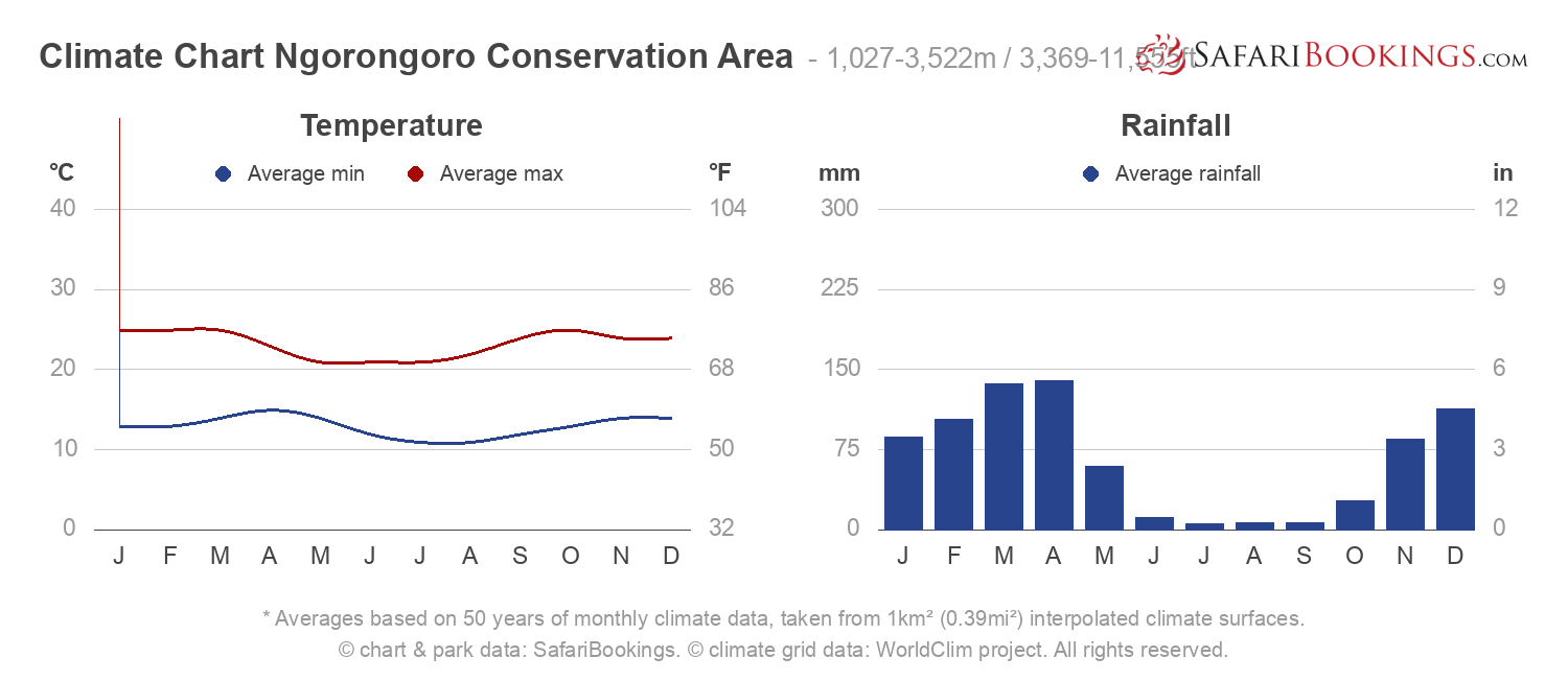 The weather in Ngorongoro Crater can vary depending on the time of year. Generally, the dry season from June to October offers mild temperatures during the day, with average highs of around 20-25°C (68-77°F), and cooler temperatures at night. This period also offers clear skies and minimal rainfall. The wet season from November to May can be unpredictable, with short bursts of rain or long periods of heavy rainfall. Temperatures during this season can be higher, with average highs of around 23-27°C (73-81°F), and the crater can be covered in mist, creating a mystical atmosphere. It’s important to note that due to its high elevation, the temperatures in Ngorongoro Crater can drop significantly at night, so visitors should bring warm clothing regardless of the season.