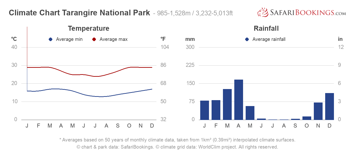 The climate in Tarangire National Park is hot and dry, with temperatures ranging from 20 to 30 degrees Celsius during the day and cooler at night.